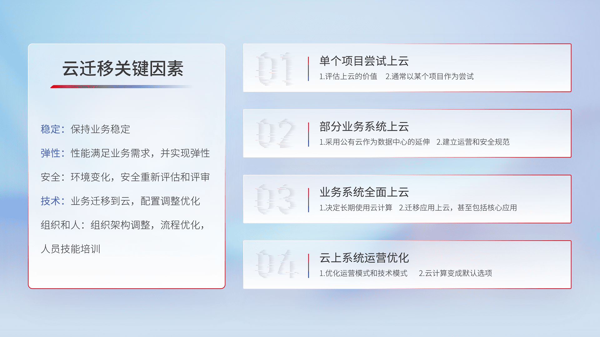 结合实际业务,,从规划设计、、、云平台选型、、、、云原生改造、、数据迁移、、集成交付,,,迁移全过程为客户识别最佳上云路径,,,做好风险识别管理,,设计网络架构、、、身份权限、、安全审计合规、、、、操作审计、、、、日志审计、、、监控告警策略、、、、多站点容灾设计等,,,对云上基础设施进行整体规划,,提升IT治理水平,,,以满足弹性、、高可用、、高性能的需求。。
